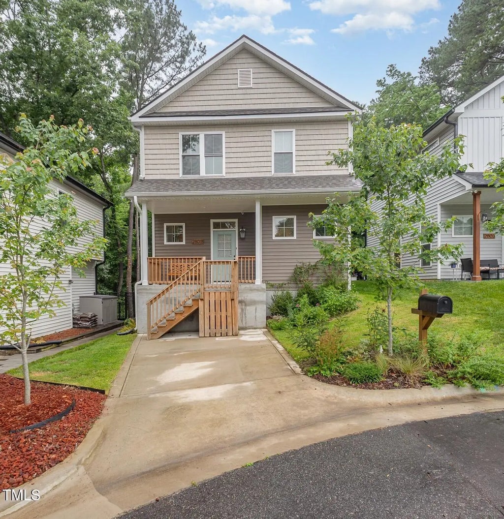 Classically styled east facing 2-story craftsman with covered front porch welcomes you into an open space with sleek, modern finishes, loads of natural light, pops of color, and space to suit a variety of styles with LVP downstairs and carpet upstairs. Downstairs features a gorgeous, white eat-in kitchen, complete with stainless steel appliances, recessed lighting, granite countertops, classic subway tile backsplash with a modern twist, and center island with large sink, pendant lights, storage and seating. The spacious family room is perfectly sized to accommodate a variety of furniture arrangements. Completing the open space is the dining area, half bath, and closet tucked under the staircase for added storage. Upstairs features 2 guest bedrooms, hall bath, laundry closet, and the owner's suite, which serves as a private retreat showcasing bright natural light from large windows, an ensuite adding a touch of luxury with step-in tiled shower with glass surround. Enjoy outdoor entertaining or relaxing on the covered front porch or back deck sized for a grill and dining table. Other amenities include an off-street parking space, granite topped vanities in all the bathrooms, and beautifully landscaped front yard. Enjoy city living in a country setting with the wooded views while being located just 4 miles to Downtown Durham providing quick access to all the fine and casual dining, boutique and retail shopping, recreational and cultural activities, Duke University Hospital and College Campus.