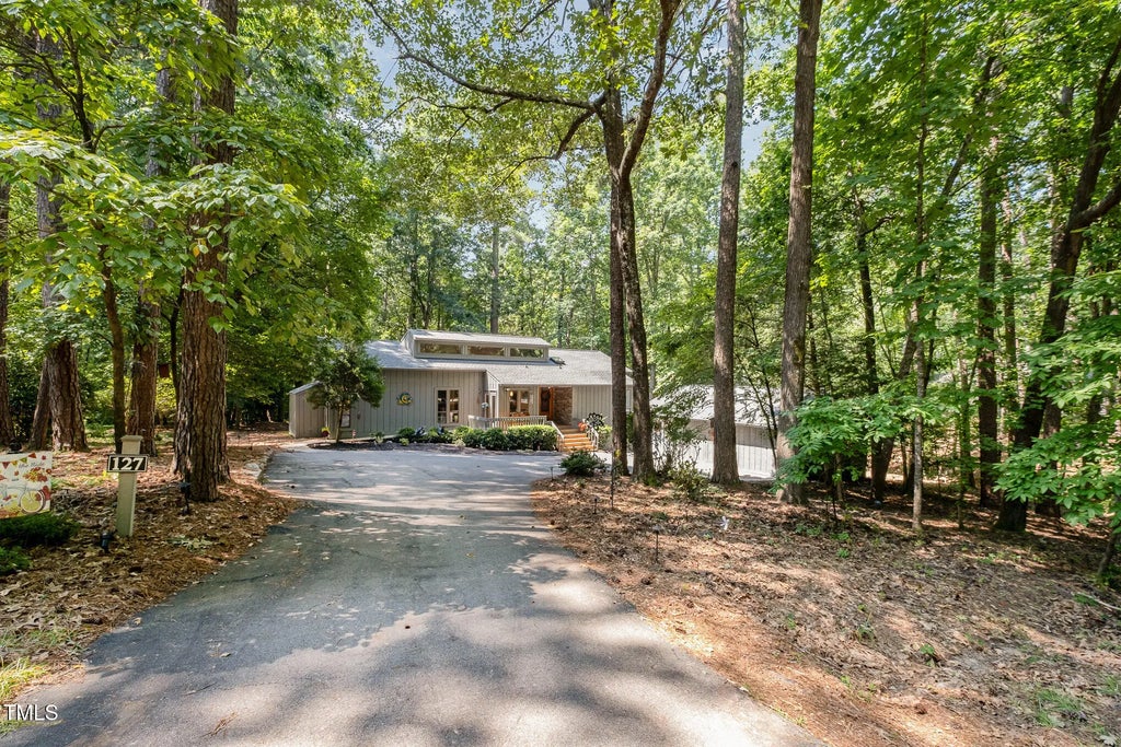 One-level contemporary home with a separate guest house/office/studio on a .9-acre lot in the ''historic district'' of Fearrington Village. This home blends into a wooded, natural setting and it has great privacy and views. Beautifully maintained and updated. The main house has an entry foyer, large living room with a wall of built-in shelving, fireplace, and vaulted ceiling with clerestory windows. The dining room can be at one end of the living room or in another space currently used as a sitting area adjacent to the kitchen. The kitchen features a well-organized pantry, an island, and a breakfast nook with a glass door that opens to the front deck. The primary bedroom suite is at one end of the house and includes a vaulted ceiling, private bath, walk-in closet, and a sunroom. The laundry room is conveniently located near the primary bedroom closet and provides a lot of storage space. The other two bedrooms and full bath are at the opposite end of the house. One of these bedrooms is quite large with room for a sitting area or study. There's a deck at the back of the house overlooking the woods. The separate guest house/office/studio has a full bath and a kitchenette. There is a walk-in area under the main house for storage and workshop space. Exterior storage closet for garden equipment. The main house has a 3-zone HVAC system, and the guest house has two mini-split HVAC units. Tankless water heater. Handicap accessible with cleverly placed ramps at the front entry deck and guest house.
