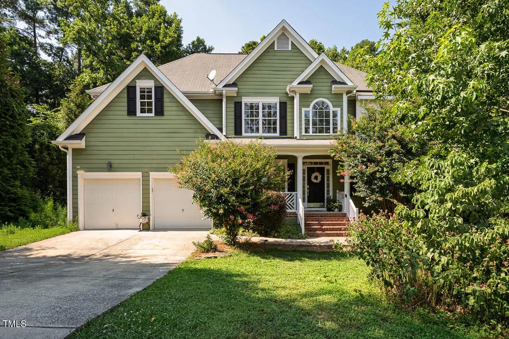 Beautiful custom South Durham home in Wellington Forest with finished walkout basement, five bedrooms, and four full baths. An oasis of privacy and fun, with exceptional convenience to everything you want. Enjoy the stunning two-story wall of windows in the family room framing mature trees and landscaping, while front windows overlook the landscaped community pond. Pool and play area are just around the corner, and Southpoint Mall is easily walkable or bikeable. The main-floor bedroom has private access to a full bath with walk-in shower designed for accessibility. The fully finished walkout basement features a home theater with integrated technology, a game room with convertible pool/game table, moveable bar, full bath, and kitchenette stub-ins - ready for an in-law suite or apartment. Upstairs, the large primary suite is a true retreat with abundant natural light, serene views, a generous walk-in closet with built-ins, and a spa-like bath. Three additional bedrooms along an open bridge walkway offer unique features like a window seat overlooking the pond, blackboard half-wall, and built-in display shelving. Take advantage of the open kitchen with stainless appliances, pantry and breakfast nook that opens to the deck. Entertain in the beautiful separate dining room. And, the versatile office/den/music room with French doors offers privacy for whatever function serves your lifestyle. A two-story deck overlooks the fully fenced backyard featuring lovely mature trees and landscaping, a main-level platform wired for a spa tub and a large patio that extends from the walkout basement. Special features include the covered front porch entrance, an oversized garage with hanging storage and Simplisafe security system. Check the provided survey from 2016 to view the public sewer easement (maintained by the city) and creeks beyond the fence and contained in the open space/lot to the right of the home. Everything you want in one exceptional South Durham home. Motivated sellers open to providing financial credit at closing for updates buyers wish to make.