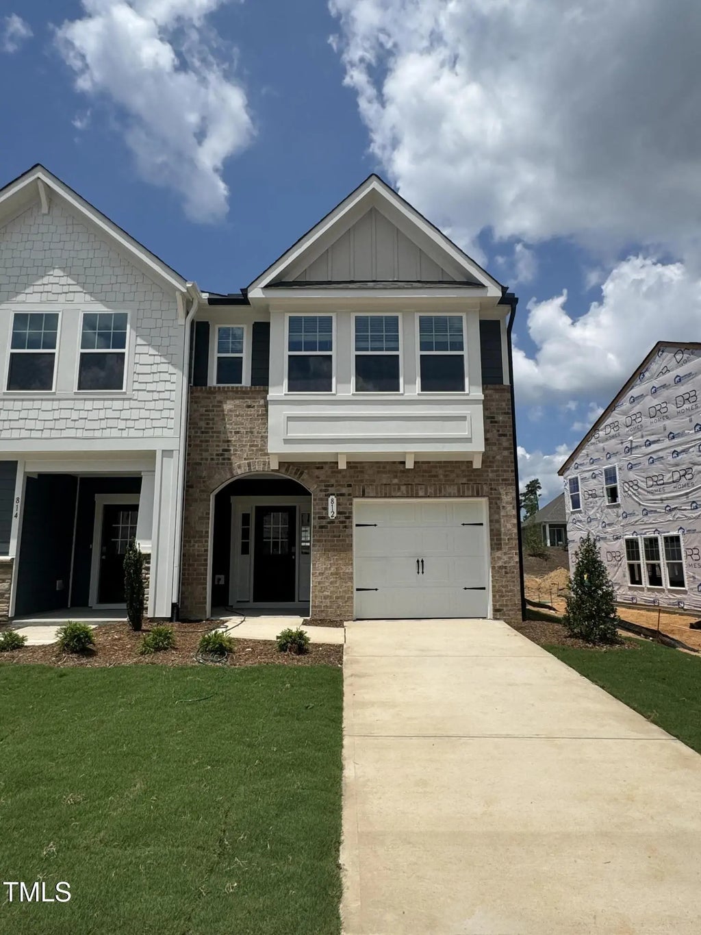 Looking for a home that offers style, privacy, and convenience? This end-unit townhome delivers, with a signature brick-arched front porch, luxury finishes throughout, and a tucked-away location just minutes from the vibrant downtown Fuquay-Varina. Inside, you'll find luxury vinyl flooring on the main level, oak wood stairs, and an open-concept layout centered around a bold 9-foot kitchen island. The kitchen features soft-close cabinetry, gas cooking and flows seamlessly into the sunlit living area—ideal for everyday living or entertaining. Upstairs, the spacious owner's suite includes a walk-in closet and tiled walk-in shower, while two secondary bedrooms share a bath with a dual vanity and soaking tub. Thoughtful design details and a private one-car garage make everyday living easy and efficient. Set in a low-maintenance community surrounded by green space, trails, and a dog park—this home offers the perfect blend of comfort and connection in one of Fuquay's most private townhome communities. Home to be finished early November 2025. *Photos of a similar home*