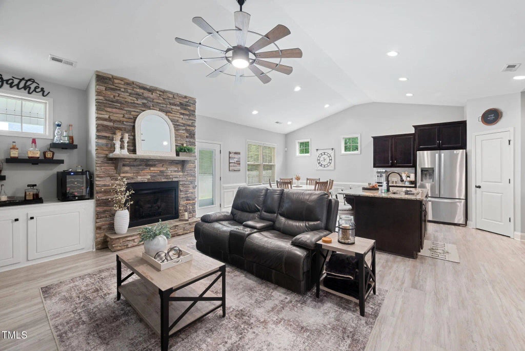 Move-In Ready - Better Than New Ranch Home! The open concept layout features a stunning floor-to-ceiling stone fireplace with gas logs and TV hookups, and a stylish bar area with floating shelves and cabinets. The gorgeous kitchen boasts an oversized island with a single-bowl sink, subway tile backsplash, large pantry, and stainless steel appliances—fridge included! New LVP floor throughout - no carpet! Enjoy added touches such as wainscoting and lots of windows in the breakfast nook, a spacious drop zone, and a dreamy laundry room with cabinets, butcher block counter, floating shelves, and sink hookup. Washer and dryer convey! The large primary suite offers a tray ceiling with crown molding, his-and-hers closets, and a spa-like bath with separate vanities, a 5' walk-in shower, and private water closet. Outdoor living shines with an inviting front porch, an extended covered patio ready to be screened, and a fully fenced yard with lush sod in front and back. Additional features include an iWave-R air cleaner, ADT security system ready to transfer, half bath with pocket door, and oversized finished garage with four ceiling storage racks. Ashcroft is a sought-after community in Clayton offering a prime location just minutes from Downtown Clayton, major highways, and scenic trails along the Neuse River. Residents enjoy Craftsman-style homes, sidewalks, and a welcoming neighborhood atmosphere, with easy access to the Mountains-to-Sea Trail, Sam's Branch Greenway, and local shopping and dining. Homeownership includes a Fred Smith Club Bronze Membership, providing access to fitness centers, indoor and outdoor pools, trails, and limited golf privileges, with options to upgrade for expanded golf access and additional amenities. This vibrant, amenity-rich setting blends small-town charm with resort-style living, making Ashcroft the perfect place to call home.