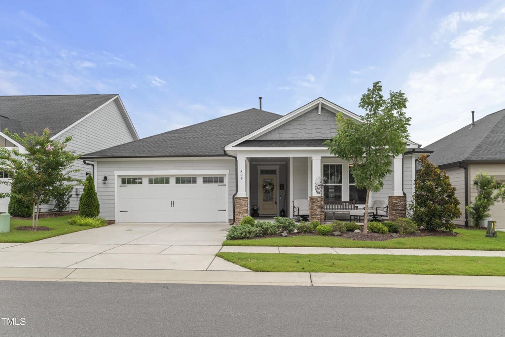 Welcome home to low-maintenance living in the sought-after Encore 55+ section of Wendell Falls! Built in 2022, the Edgemont floorplan offers 3 bedrooms, 2.5 baths, and a study—all thoughtfully designed on one level. The open layout features a spacious living room with a cozy gas fireplace, a bright dining area, and a modern chef's kitchen complete with quartz countertops, upgraded stainless steel appliances, upgrades galore, and a large center island perfect for gathering. The owner's retreat boasts a tray ceiling, expansive walk-in closet, and a spa-like zero entry shower! Step outside to a true showstopper—your own 3-seasons room and an outdoor entertainment patio featuring brick pavers, wall seating, and built-in lighting. Whether it's morning coffee or evening get-togethers, this space is designed to enjoy year-round. Additional highlights include laminate plank flooring throughout the main living spaces, a convenient drop zone entry from the two-car garage, and thoughtful upgrades throughout. Encore residents enjoy exclusive amenities—clubhouse, pool, pickleball, tennis, firepit seating, and a full calendar of social events—plus access to all of Wendell Falls' resort-style offerings. With lawn care included in the HOA, you'll spend more time enjoying life and less time on maintenance.