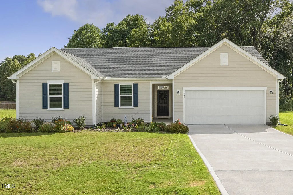 Welcome to 403 Saint Clair Drive, a stunning better than new ranch home built in 2024. Located less than 15 minutes to downtown Fuquay and Campbell University and just 4 miles to restaurants and grocery shopping in Lillington. This thoughtfully designed property features three bedrooms, two full baths, and a spacious two-car garage with a convenient side entrance. Inside, the open-concept layout connects the kitchen and living room, creating a bright and welcoming space perfect for everyday living and entertaining with beautiful luxury vinyl plank flooring. The kitchen is a showstopper with a large island, sleek granite countertops, and plenty of room to gather with family and friends. Step outside to a large patio that overlooks nearly an acre of land. With a beautiful tree-lined backyard, this outdoor space offers privacy and endless opportunities for entertaining, gardening, or simply enjoying peaceful evenings at home. Combining the ease of single-level living with modern finishes and an expansive lot, this home truly has it all. To make the move even easier, the seller is offering $5,000 in paid closing costs. Don't miss the chance to call this brand-new ranch in Fuquay-Varina your own.