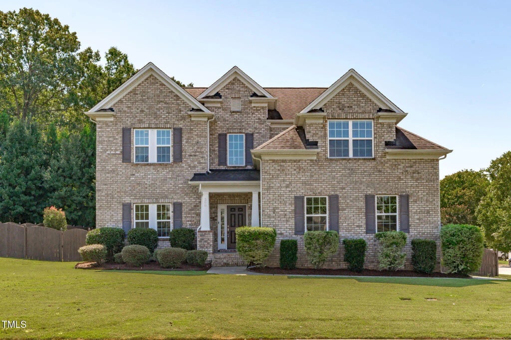 Immaculately maintained 4-bedroom, 3-bath brick front estate on a corner lot showcasing an open floor plan with model-like fixtures, varied ceiling details, elegant moldings, and engineered hardwood flooring in the main living areas. Thoughtfully designed, the floor plan offers both formal and casual spaces to adapt seamlessly to your lifestyle, beginning with the bright entry and versatile formal front room. Past the offset staircase, the home opens to the heart of the layout: a grand kitchen featuring a large island with seating for four, quartz countertops, gas range, wall ovens, pantry, and ample storage. The adjacent dining area overlooks the covered deck and landscaped backyard, flowing effortlessly into the sun-filled family room with coffered ceiling, built-ins, and a cozy gas log fireplace. The main level also includes a convenient laundry room with sink and cabinetry, a full bath, and a flexible bedroom perfect for guests, hobbies, or a private home office. Upstairs, the spacious owner's suite offers a true retreat with tray ceiling, private sitting area, abundant natural light, and a soothing color palette. The ensuite bath showcases dual vanities, a glass-enclosed shower, water closet, walk-in closet, and a relaxing corner garden tub. Two additional bedrooms share a full hall bath, while a bonus room and floored attic access provide extra space and storage. Outdoor living is abundant with a welcoming covered front porch, a covered deck with roller shades, and a paver patio perfect for grilling, dining, or fireside gatherings. The fenced backyard is both shaded and private, featuring established beds for herbs and vegetables alongside the beautifully landscaped and mulched flower beds. Centrally located near Cary, Apex, and Holly Springs with easy access to shopping, dining, and recreation across the Triangle, this home offers the perfect blend of refined style and comfortable suburban living.