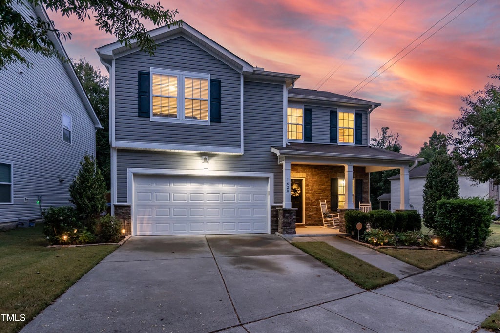 Step into this beautifully designed home featuring an open, flowing layout that encourages connection and togetherness. A charming rocking chair front porch with stone accents welcomes you into an elegant foyer entry. The spacious kitchen seamlessly opens to the great room, creating a perfect space for entertaining and daily living. Large sliding glass doors lead out to a private patio ideal for BBQs or simply relaxing outdoors. Upstairs, four generously sized bedrooms are anchored by a versatile loft area at the top of a striking wrap-around staircase.