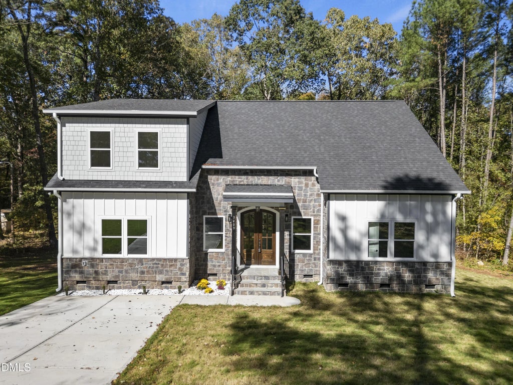 Beautifully crafted custom home at the end of a quiet street close to Durham downtown. Surrounded by a protected forest with no HOA, this residence offers a rare blend of privacy and modern living with ample spaces. The open-concept design features four bedrooms—two conveniently located on the main floor with two full baths—along with high ceilings, abundant natural light, and elegant finishes throughout. The chef's kitchen showcases a large cascade quartz island, built-in oven, and sleek cabinetry that flows into a bright living area with a electric fireplace and access to a private deck. Upstairs, a spacious bonus room is perfect for a home theater or recreation space, complemented by an additional flex room ideal for an office or studio and two more bedrooms. With premium materials, fiber cement siding, thoughtful design, and a peaceful natural setting just minutes from downtown Durham and RTP, this home defines modern comfort and timeless appeal.